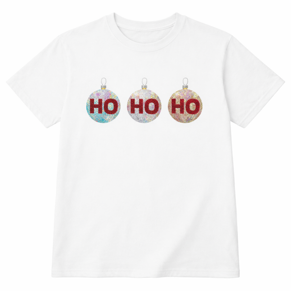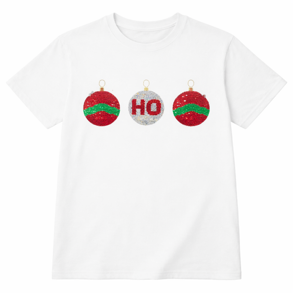 Interactive Sequin Design – Run your hand across the shirt to reveal a surprise! The bold "HO HO HO" text magically transforms into sparkling red Christmas ornament baubles. It's like two shirts in one! ✋✨